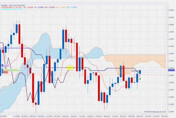 Avant, je voudrais mettre en garde contre les idées reçues concernant les baisses de taux. Logiquement baisser le loyer de l'argent fait baisser sa valeur , l'augmenter au contraire la fait monter. C'est mécanique. Partout ailleurs lorsqu'une banque centrale augmente les taux, la monnaie prend de la valeur , exemple quand la banque centrale australienne augmente les taux, l'audusd , grimpe . C'est comme ça partout sauf en Europe ! Je lisais un article d'un analyste fxcm qui rapellait que la dernière fois que Trichet a augmenté les taux, l'eurodol a perdu 500 pips en flèche. De même la dernière fois que la BCE a baissé les taux, je ne me souviens pas d'une chute importante de l'euro (si ce n'est de très très courte durée) . Ce que le marché va regarder c'est plutôt l'impact que cette baisse peut produire sur l'économie. Puis il écoutera le discours de Draghi a l’affût du moindre lapin pouvant émerger du chapeau. Conclusion, on peut chuter, mais on peut aussi partir à la hausse a l’assaut des 1.34/ 1.35 .