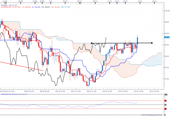 Nous avons cassé Tenkan à 15 heures (bougie encadrée de jaune) et franchit la droite en pointillés bleus (tenkan weekly + kijun daily) , je dis "franchit" parce que tant que nous ne clôturons pas sur ces TF, on ne peut pas dire "cassé" . La cassure entraîne chinkou hors du nuage, j'entre en position. Quelques minutes après interviennent des rumeurs d'accord concernant le budget. Wall Street ouvre en hausse.