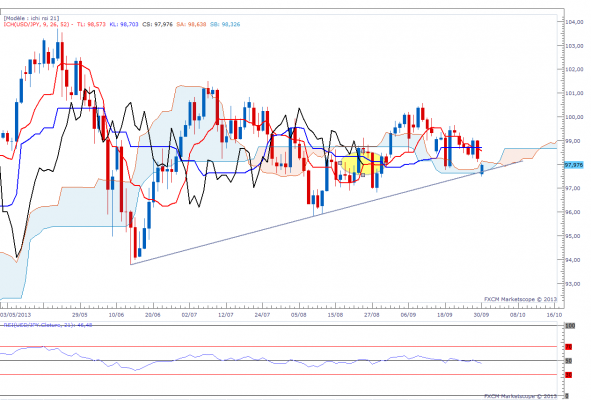 USDJPY daily (annonces économiques de Mr ABE cette nuit , très attendu par le marché) encore une fois selon moi, malgré les alertes, le gap, etc, je ne vends pas, j'attends