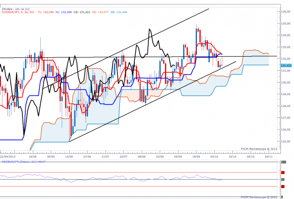 Je ne vois pas encore matière à entrer short sur EURJPY, nous sommes toujours soutenus par Tenkan et par la borne basse du canal haussier , kijun en objectif si ça casse.
