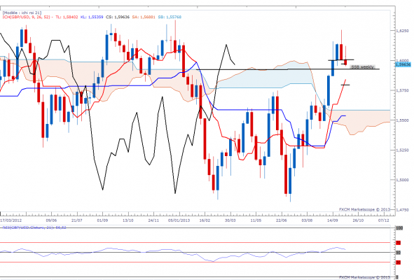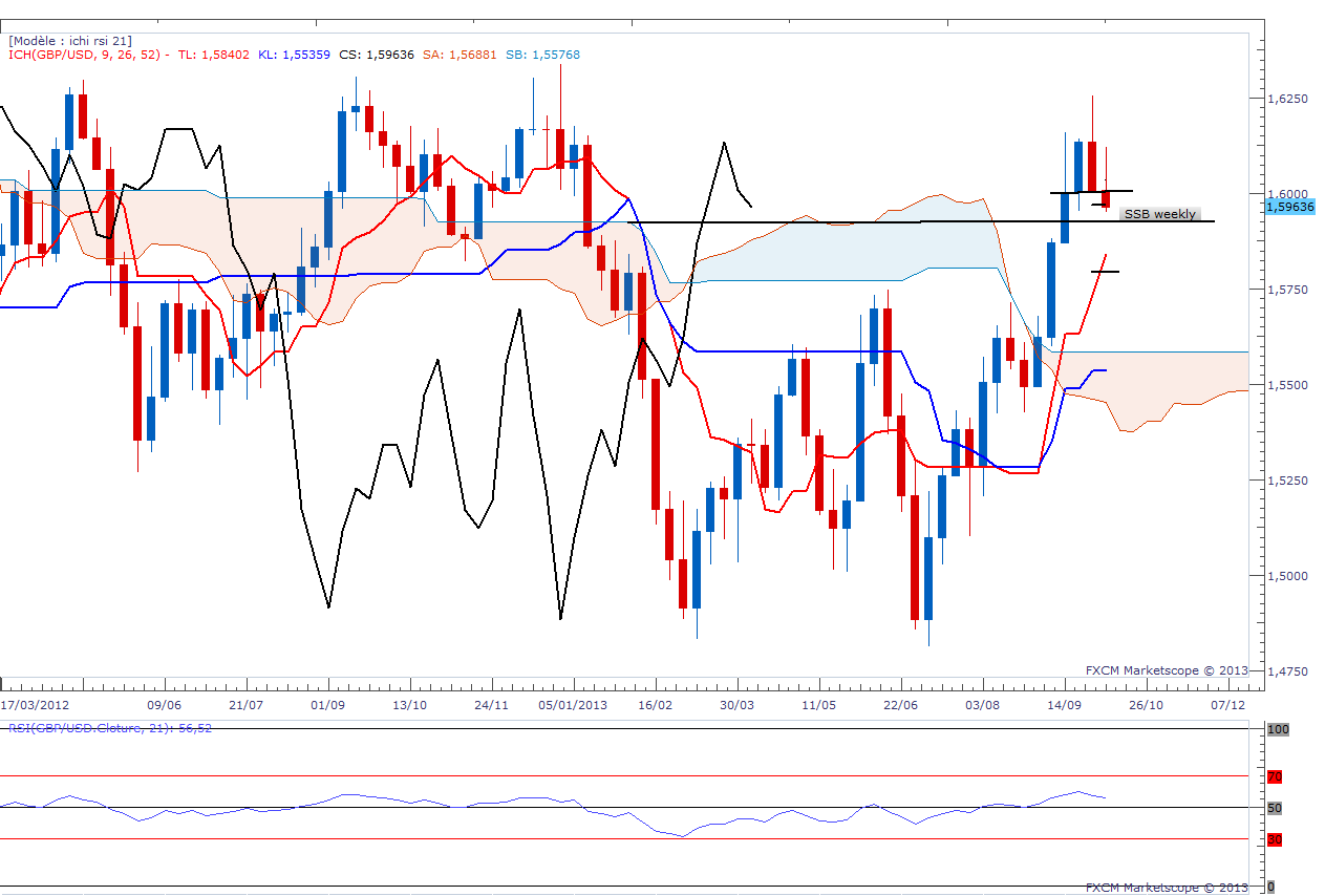 GBPUSD weekly, il faudra tenir compte de l'extension de SSB (elle peut être franchie en séance, mais la clôture est à observer) , tout reste encore haussier , même si on est pas parvenu à casser les plus hauts, RSI 21 toujours haussier aussi.