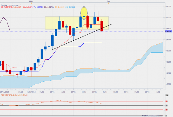 Je m'aide avec le RSI 21 et la lecture des chandeliers japonais, comme vous avez pu le lire sur les billets précédents et ici http://www.ichimoku-kinko-hyo.info/pages/exemples-de-trades/ex-de-trade-ichimoku.html