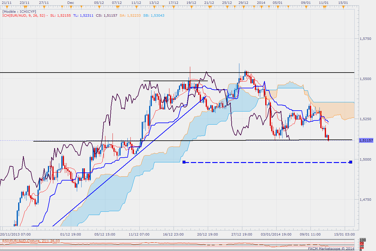 EURAUD H4, la cassure de la droite noire (à la baisse) est selon moi un possible signal de vente pour aller chercher la SSB (ligne en pointillés bleus) . N'oubliez pas que cassure c'est en clôture ! Sinon gare aux mèches !