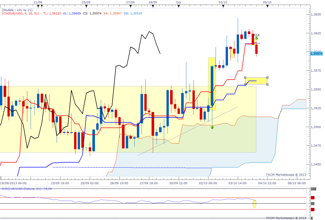 Comme vous avez pu le constater depuis quelques jours je suis resté long eurusd avec un objectif à 1.37 . Cependant avoir un objectif, n'empêche pas de savoir tourner sa veste en fonction de ce que nous raconte ichimoku sur les graphiques.