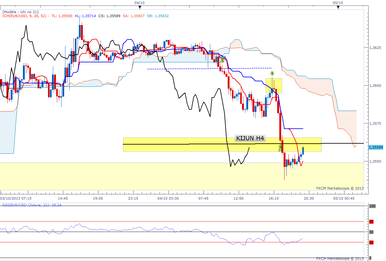 Que de faux signaux, belle cassure Kijun H4 et tenkan H4 et cassure d'une ext Kijun H1 avec en support SSB H1 pour espérer 1.36 et plouf derrière.