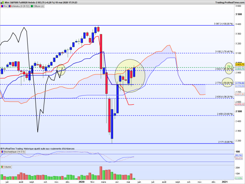 Pour aller encore plus loin je vous invite à regarder cette vidéo du 12 mai 2020 à partir de la minute 53 'qui vous montrera aussi comment interpréter les structures des chandeliers japonais sur les seuils clés évoqués dans les épisodes précédents. Ici il s'agit de l'importantissime niveau de retracement de 50 % de Fibonacci et la kijun weekly de l'ichimoku kinko hyo