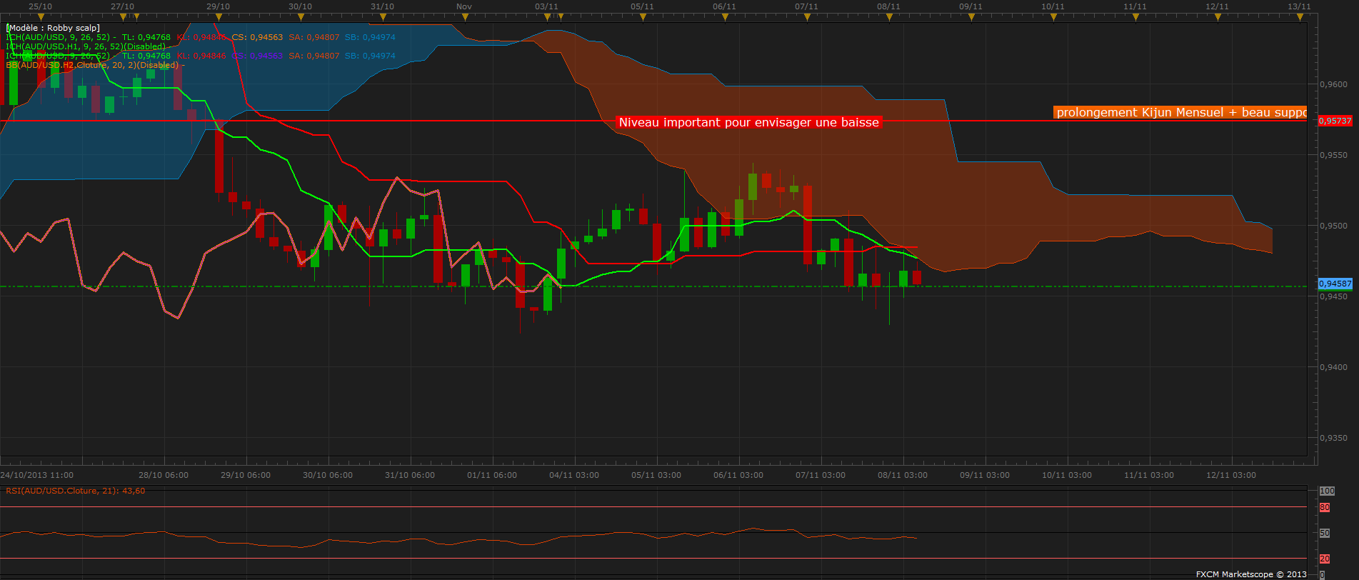 La cassure du plat kijun (fibo 0.38) par le haut conduirait a 0.96 (ssb H4 (droite identifiée par foribex sur le mensuel) puis a 0.97